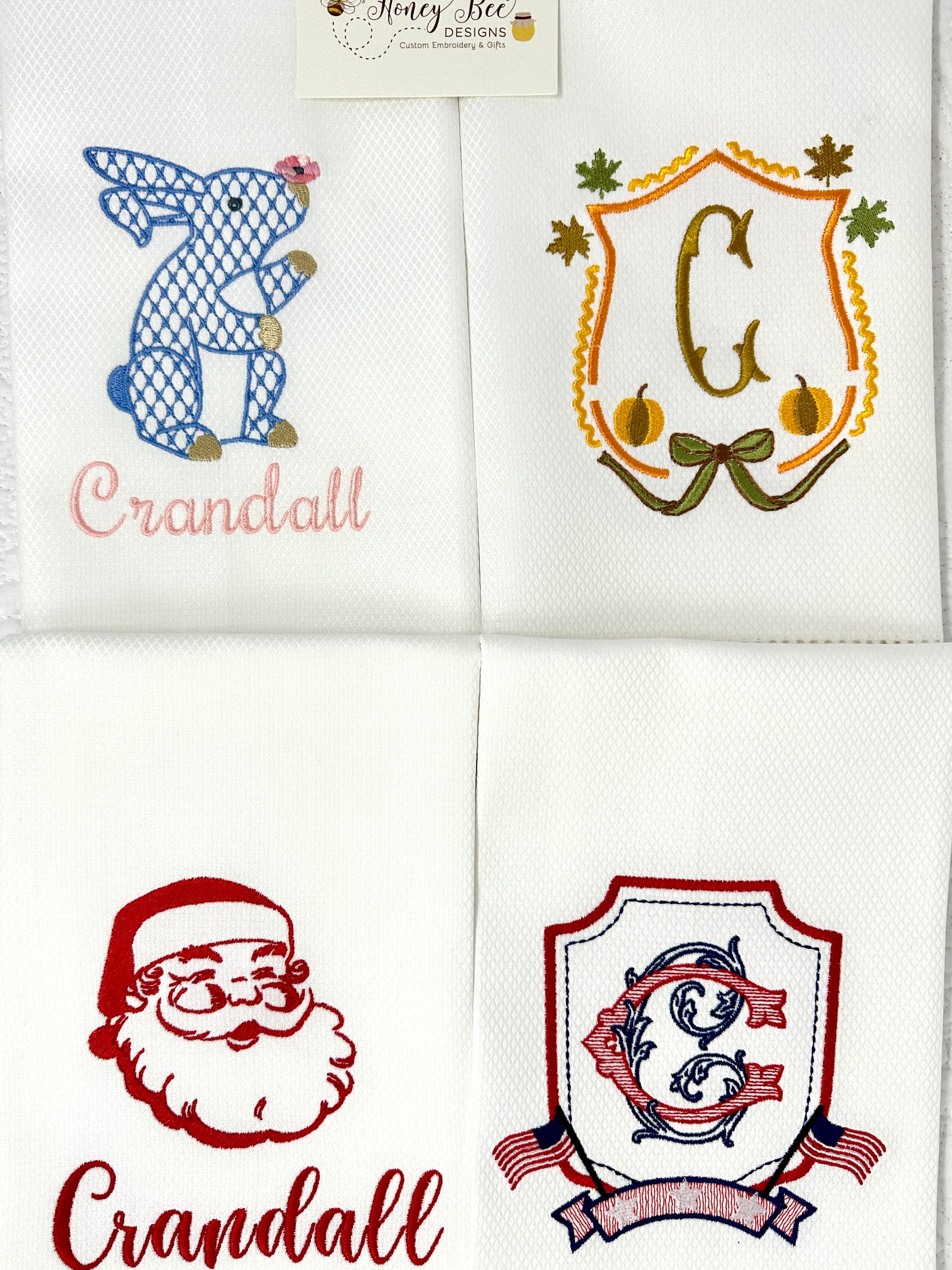 Seasonal Hand Towel Set includes a 100% cotton Huck towel for four holidays. We will pick the perfect holiday design for your set making this a unique, thoughtful gift for the person who has everything, to be used year after year.