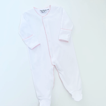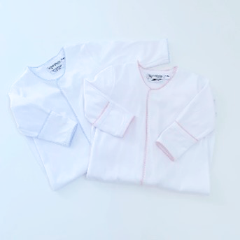 Picot footies have been redesigned for a better fit and a sweeter look. They are made of soft organic cotton, have fold over cuffs, and have hidden snaps. Includes standard monogram or font.
