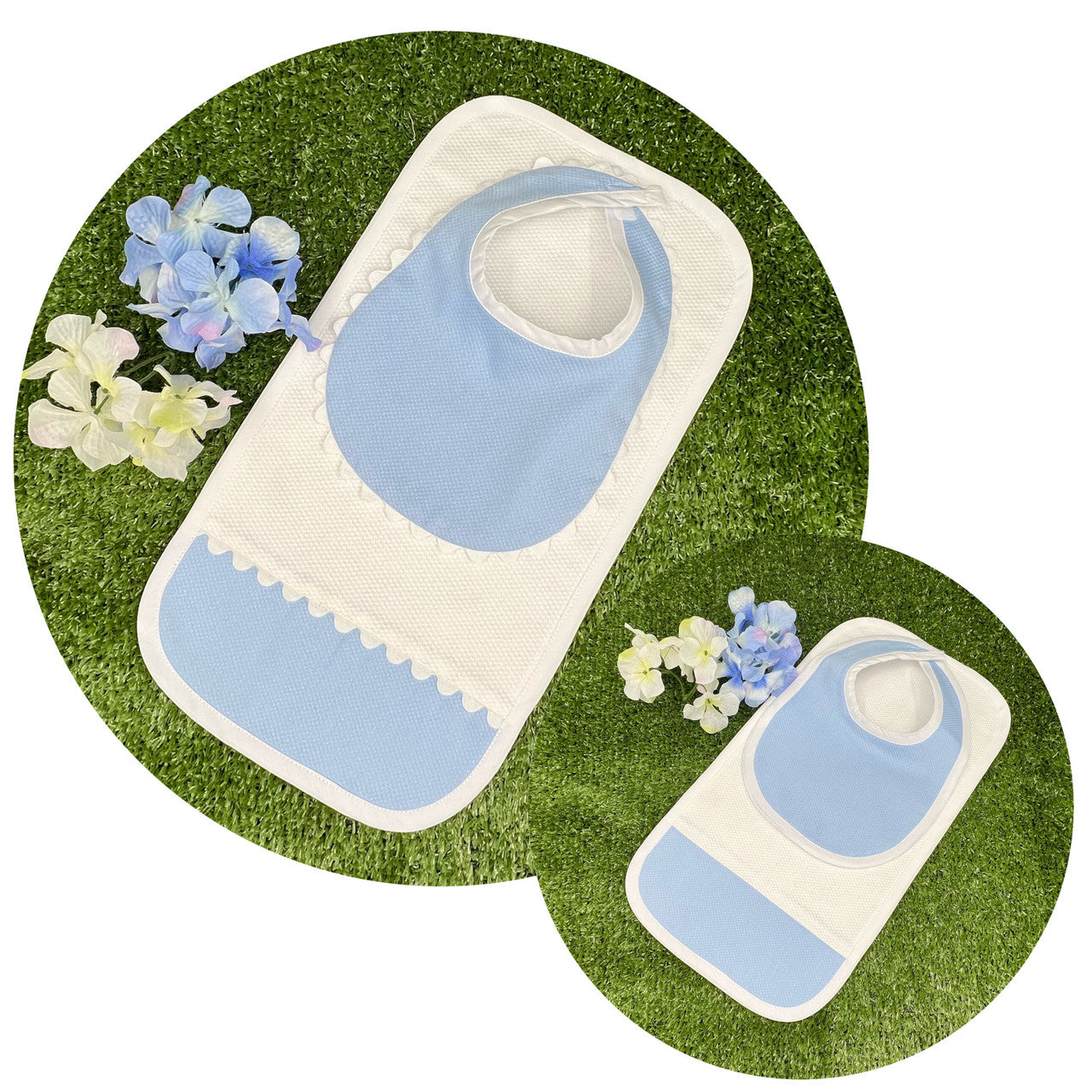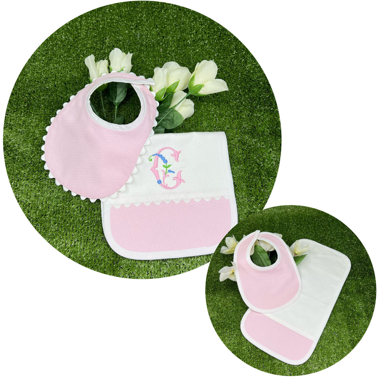 Cotton Pique bib and burp cloth set with or without ric rac trim.